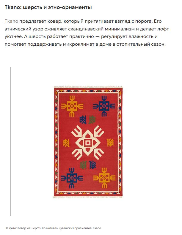 Ковер из шерсти по мотивам чувашских орнаментов из коллекции Cultural Heritage от Tkano в подборке уютных ковров для осени.