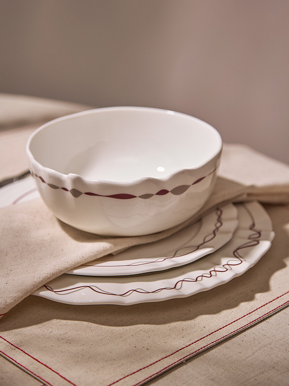 Посуда Canto — это пение птиц, запечатленное в фарфоре. Чтобы создать эти необычные тарелки, мы записали мелодичную песню соловья, скопировали звуковую дорожку и перенесли ее на фарфор, а также использовали как шаблон — чтобы придать посуде изящную асимметричную форму.