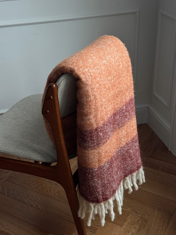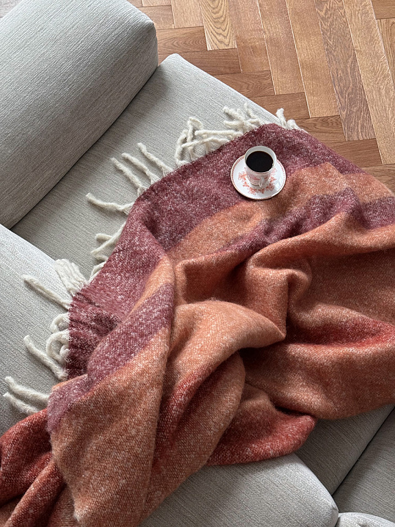 Мохеровый плед Over Horizon раскрывает историю света, тепла и тихого созерцания. Его палитра ритмично переходит от теплого терракотового до светлого с медовым оттенком. Контрастные полосы создают спокойный, выверенный ритм и ощущение визуального баланса — словно горизонт, растворяющийся в мягком рассеянном свете.