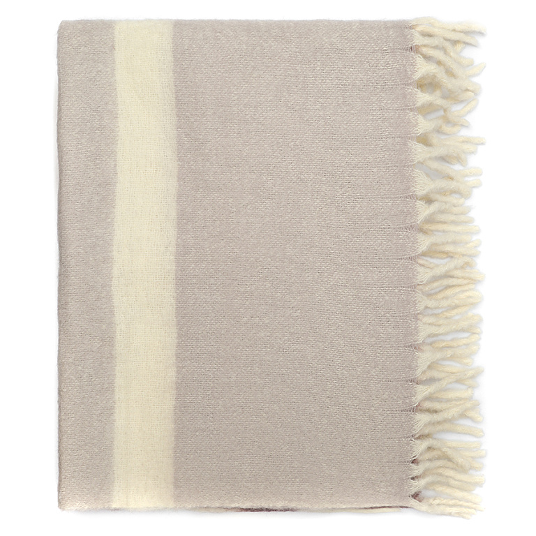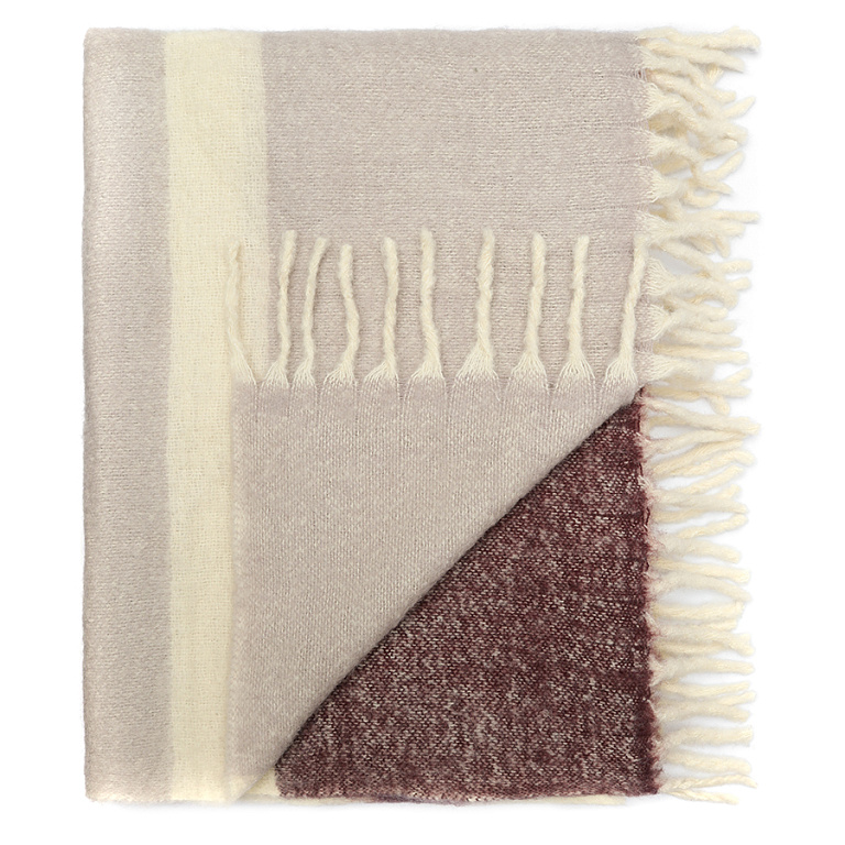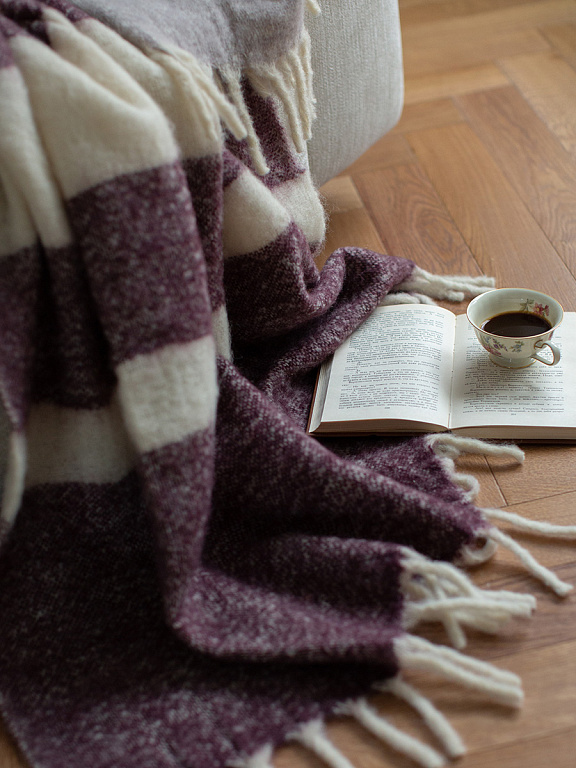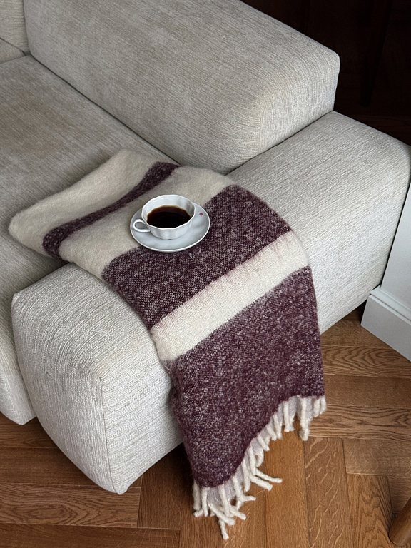 Мохеровый плед Over Horizon раскрывает историю света, тепла и тихого созерцания. Его палитра построена вокруг насыщенного и глубокого цвета марсала, дополненного мягкими молочными оттенками. Полосы выстраиваются в плавный ритм, создавая ощущение равновесия и визуальной тишины.