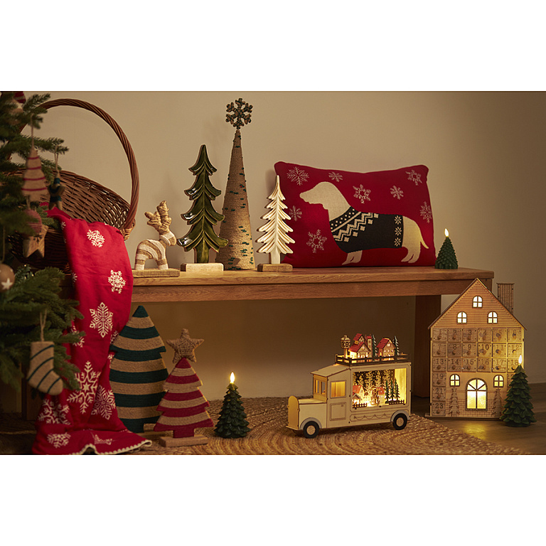 Декор изготовлен в форме грузовика, украшенного новогодней аппликацией. Милый и трогательный образ эффектно подчеркивает специальная подсветка, которая добавляет украшению особый шарм и создает праздничную атмосферу. Долгими зимними вечерами Festive truck будет согревать ваш дом уютными огоньками и поможет поверить в чудеса. Изделие выполнено из фанеры, что обеспечивает ему прочность и долговечность. Для работы требуются 2 батарейки типа АА, которые не входят в комплект.